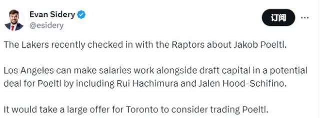 Sidery 他说,湖人队与猛龙谈判了珀尔特尔的交易,湖人队可以打包八村垒,胡德 - 席菲诺和选秀签的价格是一样的,但是猛龙预计在考虑交易珀尔特尔之前需要获得一个高价。现年 29 岁珀尔特尔的身高 2 米 十三,赛季到现在为猛龙而战 39 场,场均 14.7 分 10.3 篮板 2.6 助攻 1.2 断球 1.2 盖帽子,投篮命中率 没有三分射程的61.4%。