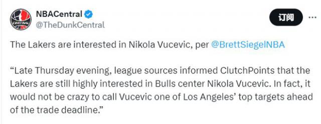 Siegel 他说,湖人队仍然对公牛队中锋武切维奇感兴趣。事实上,在交易截止日期之前,将武切维奇视为湖人队的头号目标之一并不疯狂。武切维奇吸引了包括湖人队和勇士队在内的许多球队的兴趣。公牛想用武切维奇换第一轮签,但这些球队基本上只愿意出几轮签。到目前为止,武切维奇场均 20.1 分 10.3 篮板 3.4 助攻 0.9 断球 0.6 盖帽子,投篮命中率 三分命中率55.3% 41.2%。