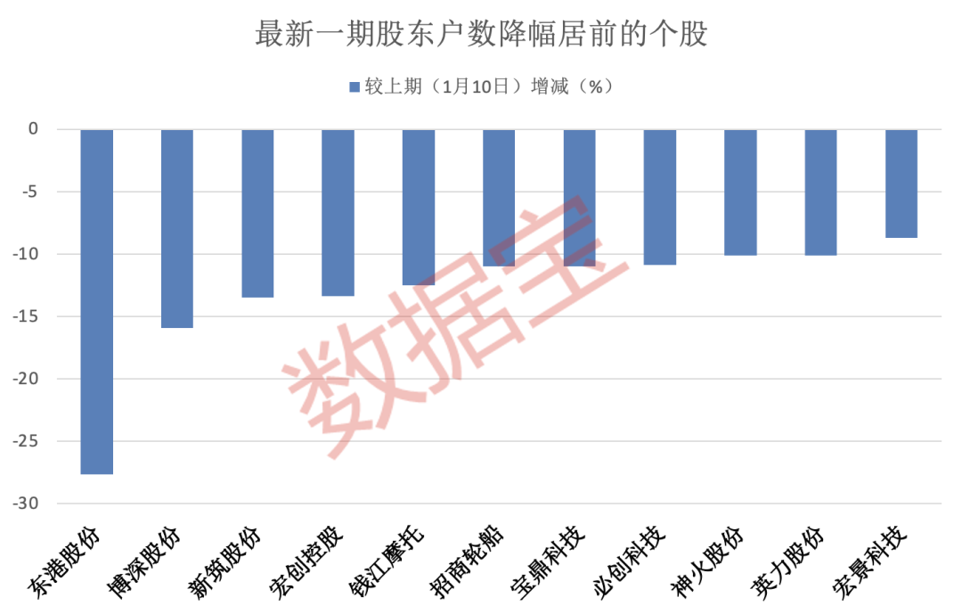 根据《证券时报》和《数据宝》的统计,排除近两个月上市的新股,共有511家公司公布了截至1月20日的股东数量。与上一期(1月10日)相比,股东数量减少了229股,其中股东数量减少了10股以上,减少率居前。东港股权,博深股权,新建股份等。