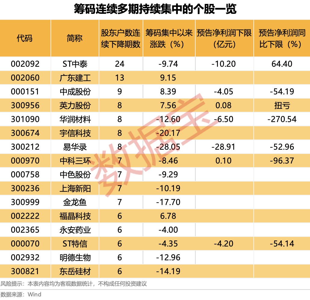 在股东户数持续下跌的股票中,连续下跌时间较长的有中泰、广东ST建设等。其中,ST中泰近期股东户数为86577户,已连续下降24期,累计下降23.28%。;广东建工连续13期股东户数下降,最新户数为80157户,累计下降9.85%。