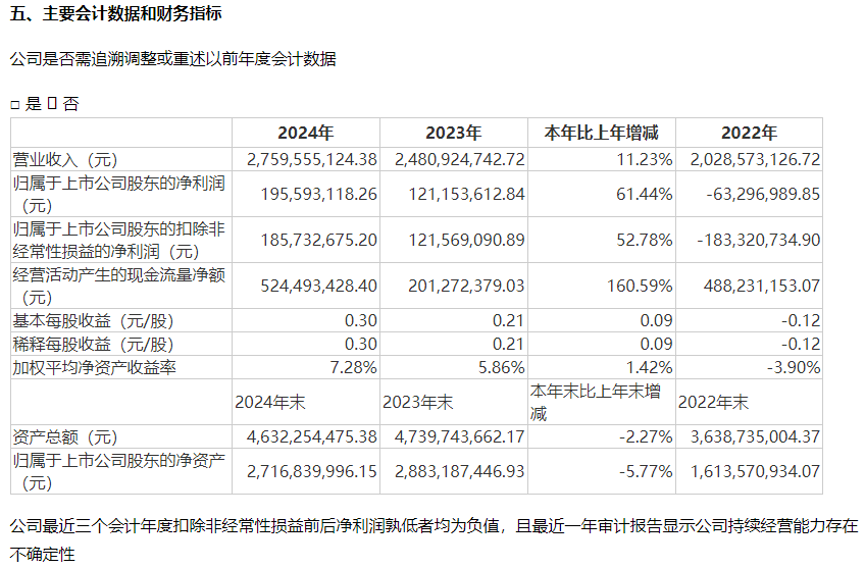 第一份a股年报正式披露。聚灿光电昨天晚上公布的年度业绩报告显示,2024年营业收入约为27.6亿元,同比增长11.23%。;归母净利润约为1.96亿元,比去年同期增长61.44%;每股基本收益0.3元,同比增长0.09%。