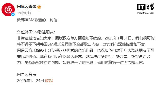 昨天,网易云音乐官方发布了《致韩国》 SM 粉丝们的一封信,表示由于版权方单方面通知不续签,韩国很可能会下架 SM 娱乐公司旗下所有歌曲内容。