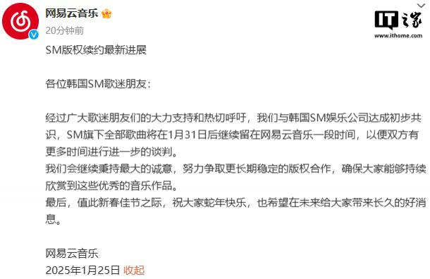 IT 世家 1 月 25 今天一早,网易云音乐宣布与韩国合作。 SM 娱乐公司达成初步共识,SM 所有的歌曲都将在旗下 1 月 31 以后继续留在网易云音乐一段时间?,这样双方就可以有更多的时间进一步谈判。