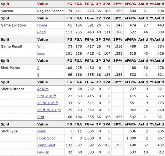 在本赛季 76 在人类赢球的比赛中,投球 175 中 73,场均 41.4%,三分 79 投 25 三分命中率只有 有效命中率为31.6% 48.9%的投球助攻率。 38.4%。但是在输球的比赛中236 投 101 中,投篮命中率 三分球,42.8% 107 投 41 中,准确率 有效命中率38.3% 投球助攻率51.5% 42.6%。