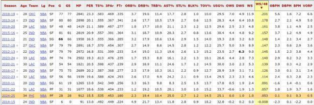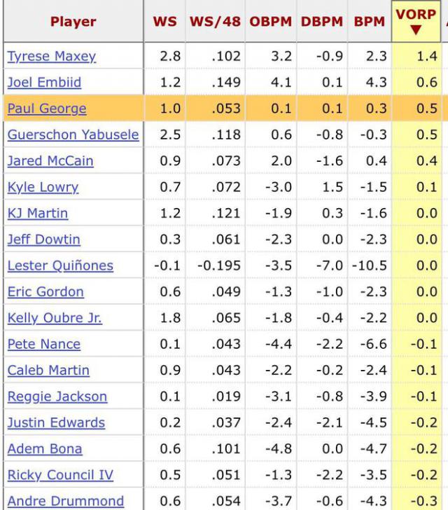 在这个赛季,保罗乔治对球队输赢的影响几乎达到了一个新的阶段,当然,最重要的是 76 人类战绩不佳,但是每 48 乔治的胜利贡献值已经只有几分钟了 0.053 防御胜利的贡献也来了。 1.0,也是职业生涯倒数第二。攻击胜利的贡献值来到职业生涯倒数第三。VORP(玩家不可替代的价值)也来了 来到职业生涯倒数第二的0.5。