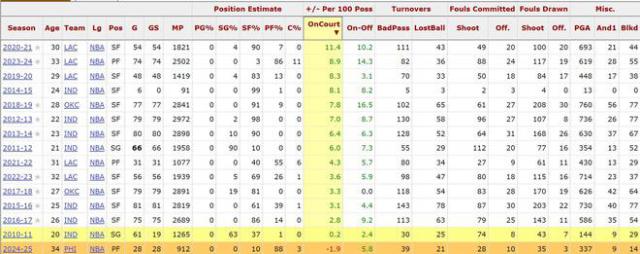 更加荒谬的是这样一支球队,在这种情况下,年薪 5000 万保罗乔治在场近百回合的正负值居然是职业生涯中最低的,也是第一次来到负数,成了球队攻防两端的负担!