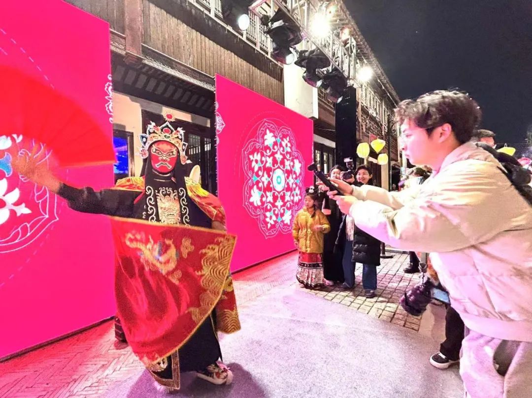 “别人庭院”遍布街区,呈现各地特色新年场景。四川、云南、湖南、福建、山西、辽宁、江南等7个“别人庭院”被游客包围。在“四川别人”门口,成都川剧院年轻演员邓方圆现场变脸,游客们兴致勃勃,一遍又一遍地看着。来自广东的郑先生说,一家人来苏州旅游,真的很惊讶能看到如此精彩的非物质文化遗产表演。