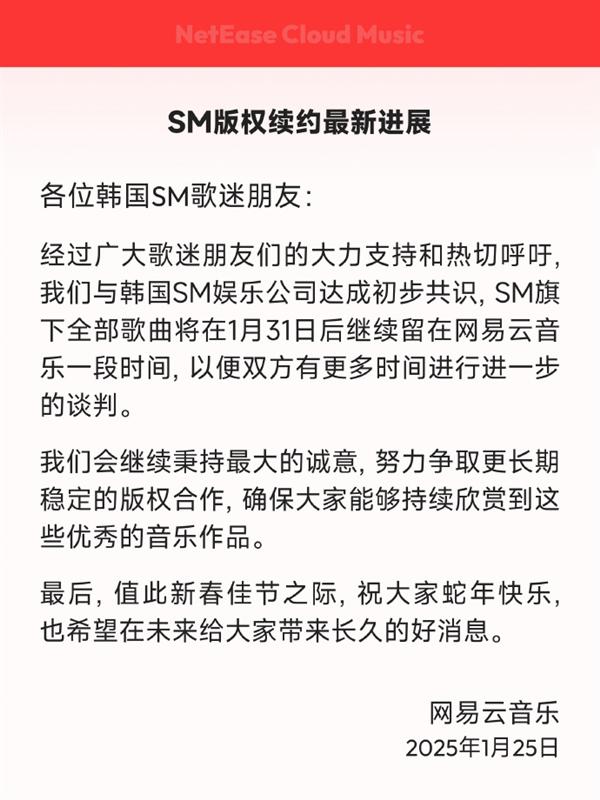 快科技 1 月 25 日消息,今天,网易云音乐发布 SM 最新版权续签进展通知,版权到期后暂时不需要下架。