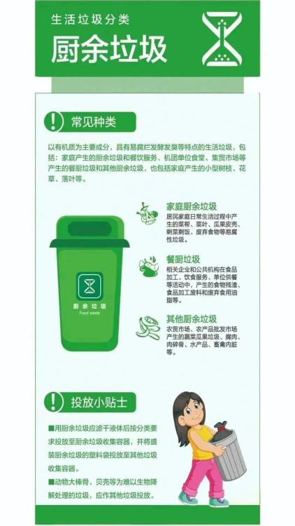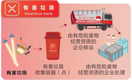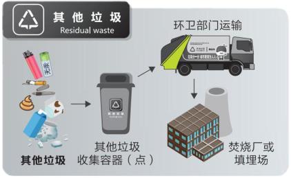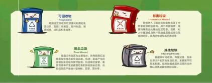 在日常生活中,您可以根据标志正确地放置厨余垃圾、可回收垃圾、有害垃圾和其它垃圾。