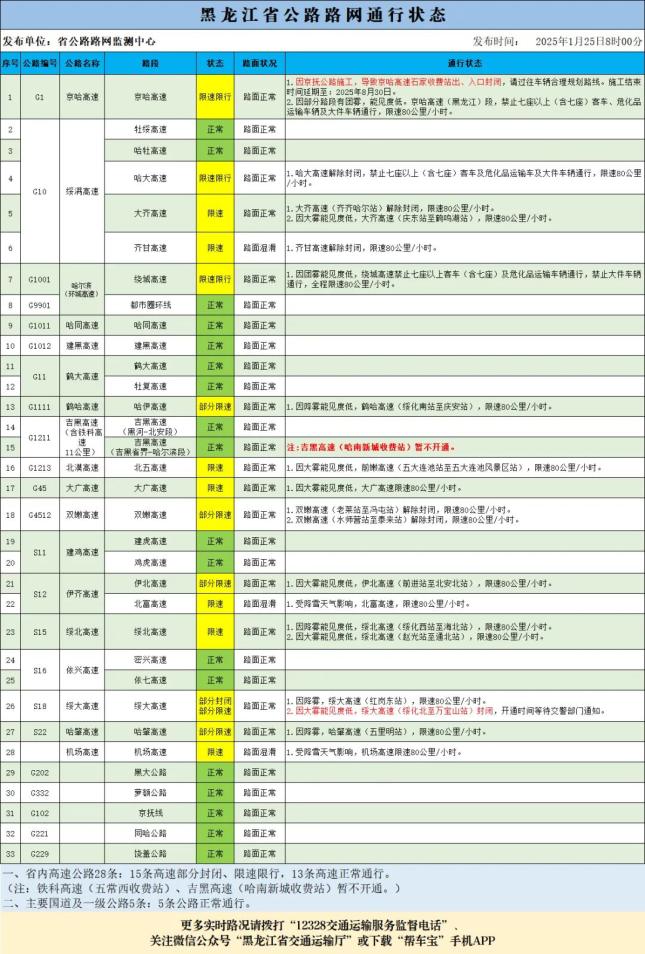 一月二十五日八时汇总实时路况:部分封闭限速限行高速(15条高速):绥大高速(绥化北至万宝山站),封闭。大广高速、北富高速、双嫩高速(从老莱站到泰来站)、机场高速、大齐高速、齐甘高速、绥大高速(红岗东站)、鹤哈高速(绥化南站至庆安站)、绥北高速、北漠高速、伊北高速(向北安北站前进)、限速80公里/小时的哈肇高速(五里明站)。3.京哈高速、哈尔滨绕城高速、哈大高速严禁7座以上(含7座)公交车、危险化学品运输车辆、大型车辆通行,限速80公里/小时。省内其他高速公路条件正常。