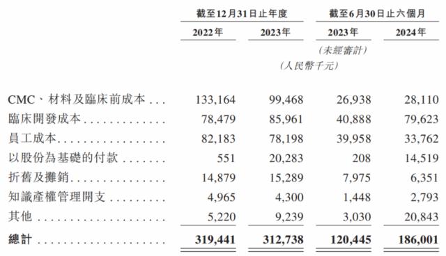 2022 年 -2024 今年上半年,公司的R&D费用分别为 3.19 亿元、3.13 亿元及 1.86 主要包括亿元 CMC、临床前材料及成本、临床开发成本、员工成本、以股权为核心的支付、折旧及摊销、知识产权管理费用等。