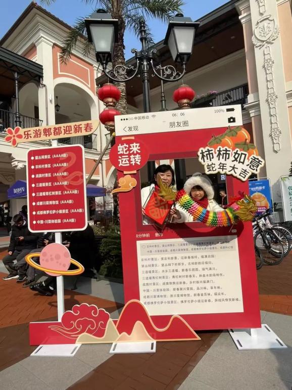 舞台旁边的打卡设备以“乐游郫都迎春”和“我为郫都文化旅游代言”为主题,以“朋友圈”和“相框”为设计风格,以郫都区8个A级旅游景点为内容,吸引了众多市民和游客拍照,成为现场一道亮丽的风景线。