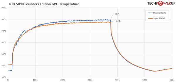 与液态金属相比,在检测过程中使用硅脂 RTX 5090 GPU 平均气温增加了大约 2°C。