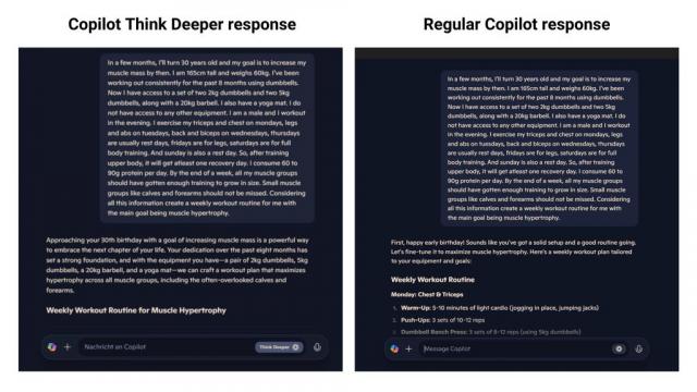 例如,在制定健身计划的测试中,“深度思考”不仅可以根据用户的提醒提供训练计划,还可以提供蛋白质摄入、训练动作细节、营养建议等更全面的指导。根据用户的目标(如肌肉肥大),这是常规的。 Copilot 为了达到类似的效果,需要多次交互。