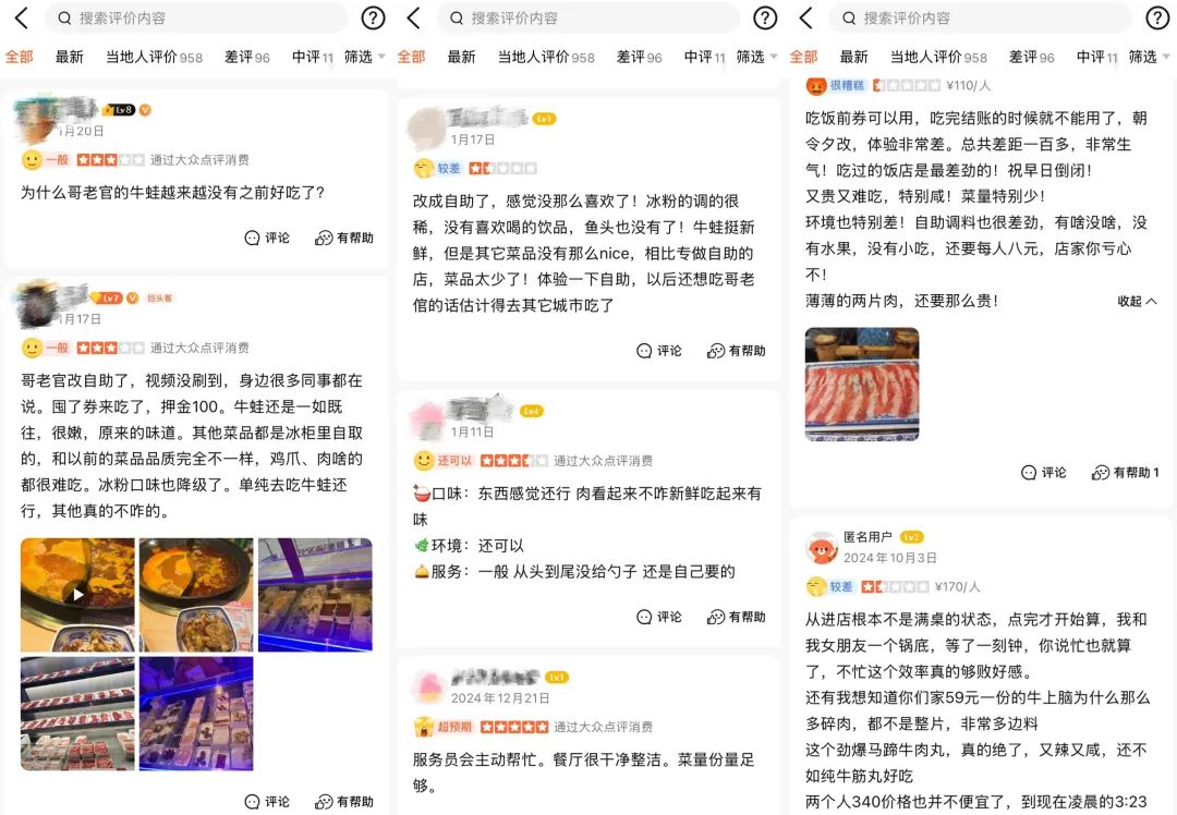 然而,这种模式的调整并没有带来预期的效果。很多顾客吐槽的感觉减少了,吃饭需要交100元的押金,菜品种类也会减少很多,质量也会大大降低。而且改成自助后也失去了品牌特色,很多原来的爆款菜品都被取消了。一些商店在改成自助模式后不久就关门了。