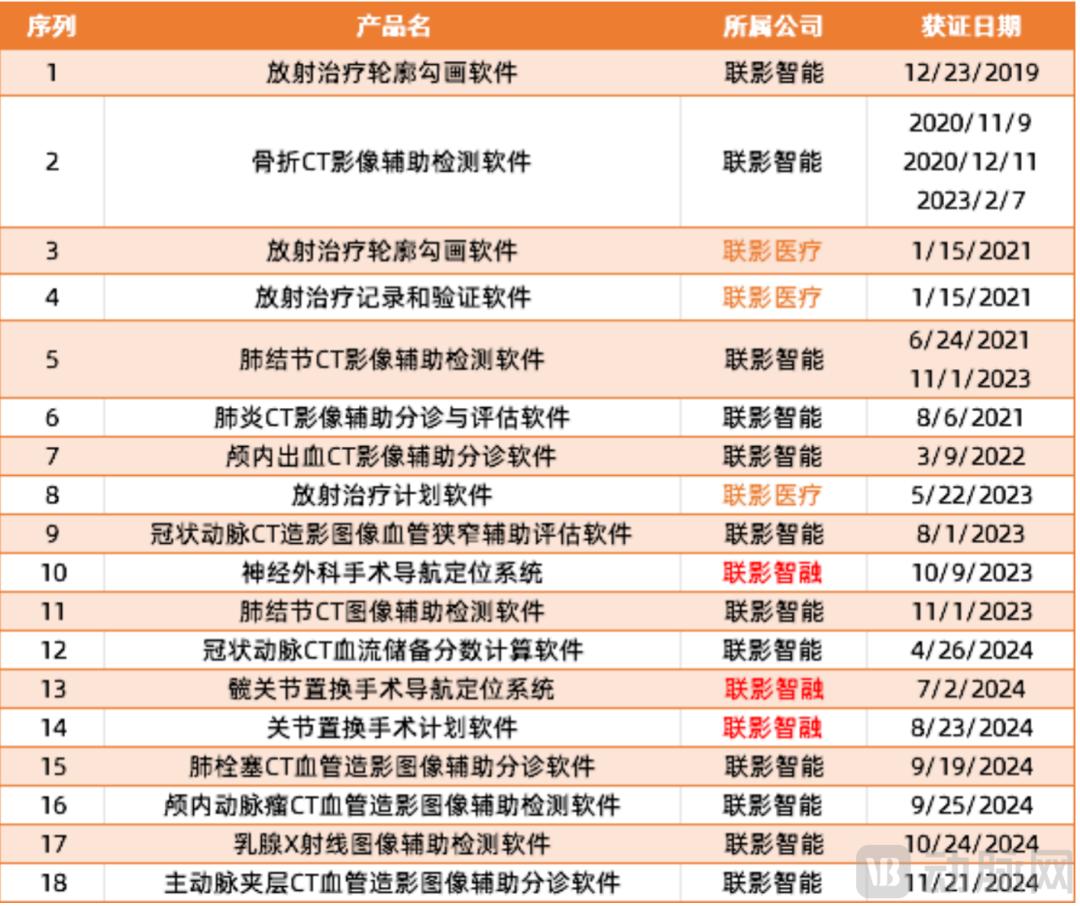 在诸多优势下,联影智能在辅助诊断AI领域迅速铺开。截至2024年12月31日,联影智能已获批22张NMPA二类证书和12张NMPA三类证书,15款应用获得FDA认证,13款应用获得欧盟CE认证,与同行拉开了显著差距。