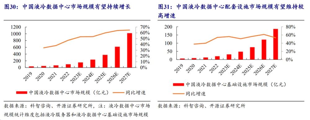 AI的蓬勃发展离不开高计算能力的支撑。随着计算芯片功耗的不断增加,液冷散热有望成为服务器和整个机柜功耗上升的首选。预计2022-2027年,中国液冷数据中心市场将继续以59%的复合增长率蓬勃发展。到2027年,液冷市场将突破1000亿大关。