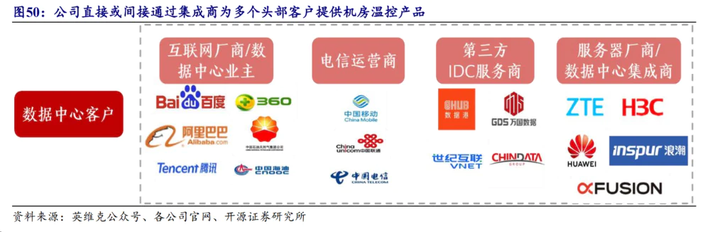 公司产品已广泛应用于百度、阿里、腾讯、360等互联网厂商;中石油、中海油、市企、教育、医疗、银行等行业客户;第三方IDC运营商,如万国数据、秦淮数据、世纪互联网、数据港;中国电信、中国移动、中国联通电信运营商;华为、中兴、超聚变等数据中心集成商和服务器制造商。另外,公司凭借丰富的液冷温控交付经验,积极与超聚变、百度等行业上下游厂商合作,推动IDC温控解决方案。