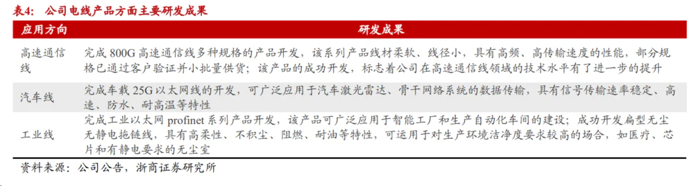 电线电缆广泛应用于下游,大型数据中心、工业机器人、汽车等领域的产品迎来了历史新机遇。公司电线系列产品由子公司乐庭智联运营,主要包括高速通信线、汽车线、工业线、消费电子线等产品。