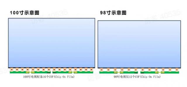 比如图像质量,100 寸比 98 寸有较好的画质表现。原因在于 COF 这种芯片贴膜技术,100 寸可以携带 16 个,而 98 寸一般带 12 个。由于 COF 如果数量大,电视的对比度会更高,色彩表现也会更好。这显著提高了电视的场景亮度、对比度和色彩饱和度,从而提供了更好的视觉享受。