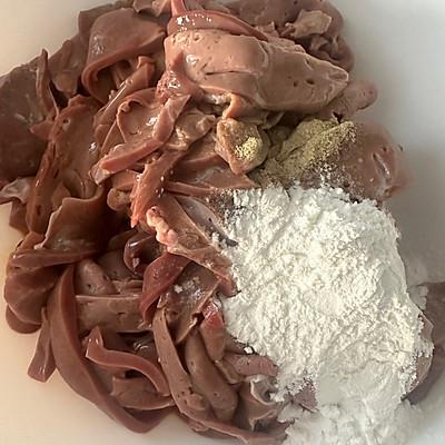 7、加入两勺淀粉,一点白胡椒,两勺酱油,一勺米酒搅拌均匀。