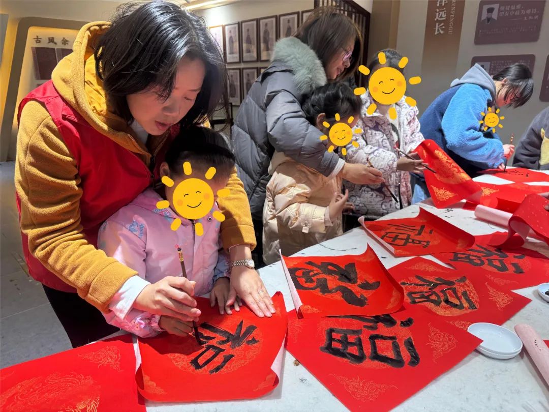 ◆洪桥镇爱心妈妈和结对儿童一起写福字,增加了过年的喜庆气氛。