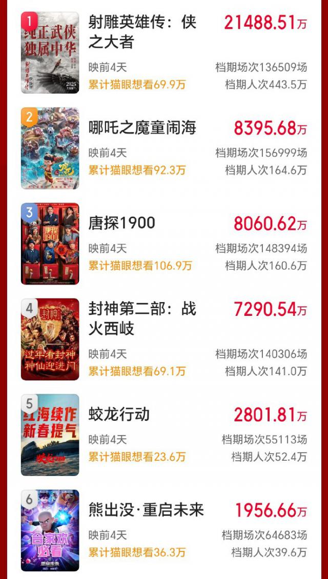 强大的预购状态和强大的片单类型阵容,已经把大家对准了。 2025 春节档的期望值完全满了。还有 4 即将到来的电影市场,哪部电影能成功夺冠,哪部新电影会上演反击?档期结束,票房能否再创新高,迎来一个好的开始?