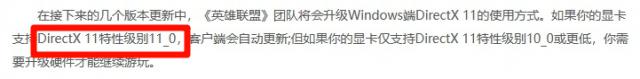 这次 LOL 升级公告中提到的 DirectX 11 ,便是 Direct 其中一个版本。然后跟随另一个参数。 " 特点等级 11 _ 0 " 实际上是用来区分适配显卡的。