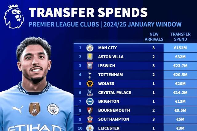 据知名媒体《足球市场》统计,在连续购买胡桑诺夫、雷斯和马尔穆什之后,英超豪门曼城正在消费。 1.52 这个冬歇期,亿欧的总金额在俱乐部支出榜上排名第一,断层领先。排名第二的俱乐部还是来自英超,但是阿斯顿维拉只花了钱。 3200 万欧,与曼城的差距整整齐齐 1.2 亿欧。