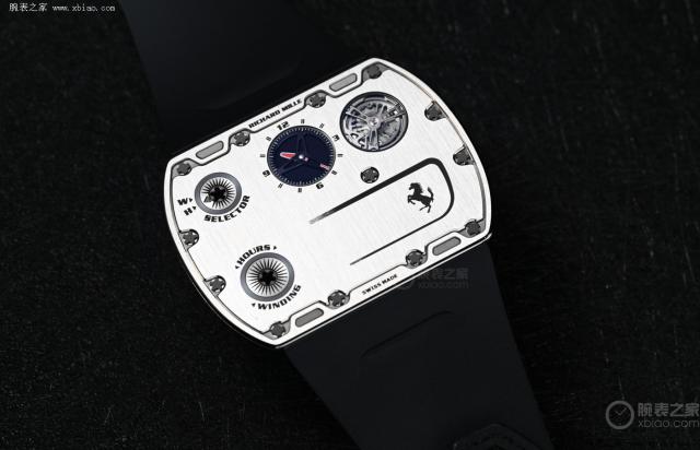 限量发售 150 枚的 RM UP-01 Ferrari,表壳由钛合金制成,重量只有钛合金, 30 克。其搭载的 RMUP-01 手动上链机芯薄而厚仅仅厚 1.18 mm、重量 2.82 克。为了追求极致的轻薄,发条盒配备了极细的游丝,而擒纵结构全部重新设计。作为与法拉利联合打造的跑车手表,可以承受高达 5,000g 加速冲击。