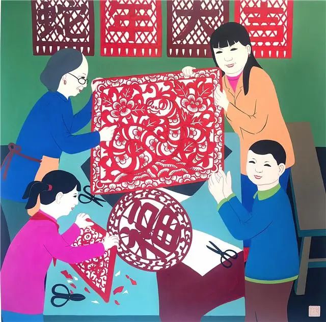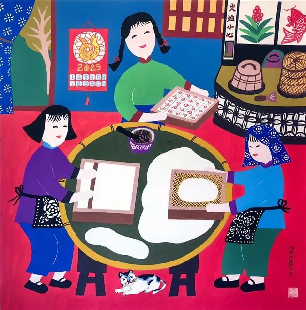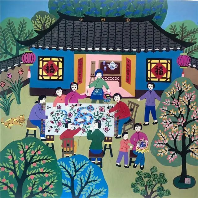 农民画中的“年味”包括作者的“回忆”和生活的“记录”。《贴春联》是农民画家朱连君的作品,描写了人们辞旧迎新的热闹场面,直观的视觉叙事生动地展现了春节的味道。图中,大人小孩穿着各种色彩鲜艳的衣服,要么贴春联,要么挂窗花,要么放鞭炮,充满了欢乐和生活气息。