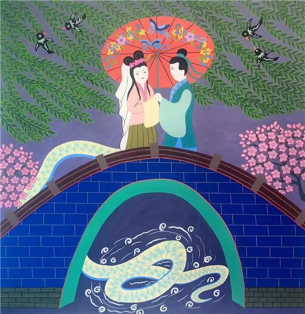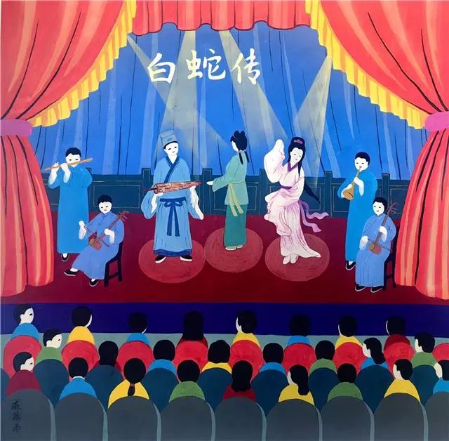 在农民画家戚藕弟的作品《白蛇传》中,许仙、白娘子、小青等人物形象鲜明,演绎了断桥带伞的片段。二胡、唢呐、竹笛等民族乐器交织在一起,非常热闹。