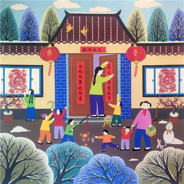 在他的书中,每条蛇似乎都有生命。窗花上,灵动的蛇盘绕着它的姿势,周围盛开的花朵代表着活力和守护。孩子们手里拿着一个蛇形玩具,鞭炮上游动着一条小蛇,对联中也充满了对蛇年美好生活的向往...