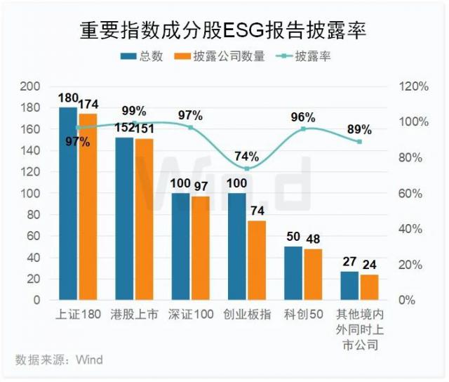 目前正处于新一年度报告季,上市公司 ESG 报告的编制也是最关键的时刻。去年,中国三大交易所(上海证券交易所、深圳证券交易所、北京证券交易所)发布了《上市公司可持续发展报告指南》(以下简称《指南》),标志着 A 首个统一、规范、实用的股票市场迎来了 ESG 公开信息标准将极大地推动上市公司升级 ESG 信息披露的质量和透明度。上交所根据《指引》的有关规定 180、科创 50、深证 100、创业板是指同时在国内外上市的公司,被列为强制性。 ESG 披露报告名单。根据 Wind ESG 团队统计,同时存在 A 股票和港股上市公司 ESG 信披准备最高,达到 99.34%;创业板上市公司准备最少,四分之一的上市公司尚未披露 ESG 报告;每个板块的平均值 ESG 报告披露率为 91.98%。