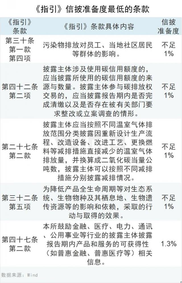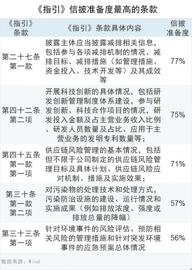 其中,信披准备性高的条款包括减排、科技创新、供应链、污染物处理、环境风险事件;信披准备性条款包括污染排放的影响、碳信用额度、温室气体分类减排、生命周期对生物多样性的影响和通用信息。