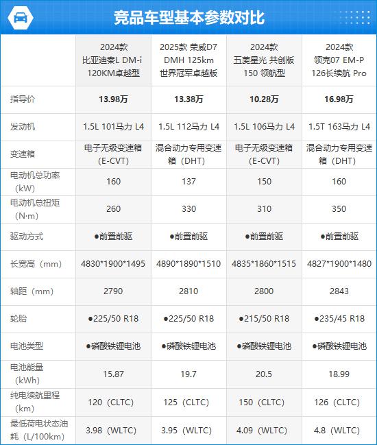 客观地说,虽然比亚迪秦 L 同级别的竞争产品并不多,但是可以压低价格 10 这一区间出头一万元,实在是凤毛麟角。综合自有品牌、中型车、插电式混合动力等核心关键词,最后我为其寻找的竞争车型是荣威。 D7、五菱星光与领克 07。值得注意的是,由于后两者的价格跨度确实有点大,所以仅供参考。除尺寸参数相对一般外,在其他设备方面,比亚迪秦 L 即便是与价格更高的领克 07 与此相比,也丝毫没有落下风,表现出极高的性价比。