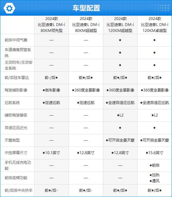 配备部分,2024 款比亚迪秦 L 高档车型的整体性能确实要显得更全面一些,主要表现在丰富的主要表现上。 / 被动安全配置和高级辅助驾驶系统。虽然入门级车型基本可以满足日常使用需求,但这些方面确实有所欠缺。但考虑到车型定位和售价范围,整体性价比表现有目共睹。