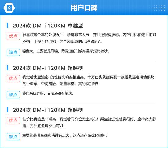 大多数消费者在用户口碑中, 2024 款比亚迪秦 L 外观设计及性价比表示满意。不过,也有车主表示这款车噪音稍大,尤其是在高速时,轮胎噪音和风噪比较明显。