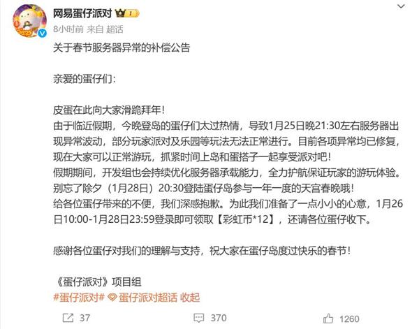 对于这一点,网易“蛋仔派对”项目组宣布,1 月 25 日晚 21:30 上下服务器出现异常波动,部分玩家派对、公园等玩法无法正常进行,目前各种异常已经修复。