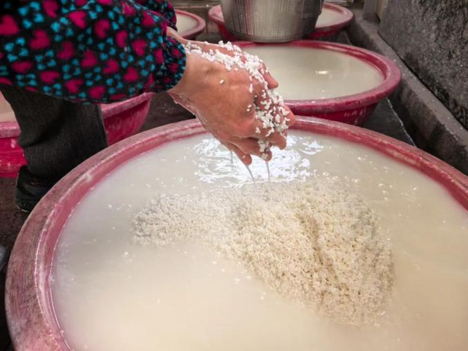 据报道,制作“快乐蛋糕”的过程比较复杂。首先,糯米和粳米要按特定比例混合,用清水浸泡几个小时,直到米粒充满水分,变得柔软饱满。然后将浸泡好的米沥干,用石磨磨成米粉,然后加入适量的糖和水搅拌。“当米粉逐渐变成松散的絮状时,再筛选出米粉,使其更加均匀细致。这一步是决定“快乐蛋糕”味道的关键因素。”何晓敏说。