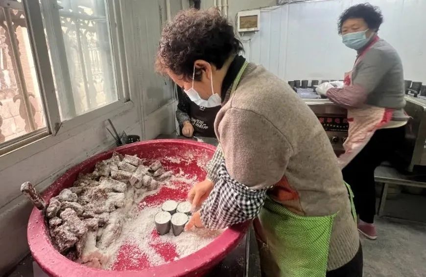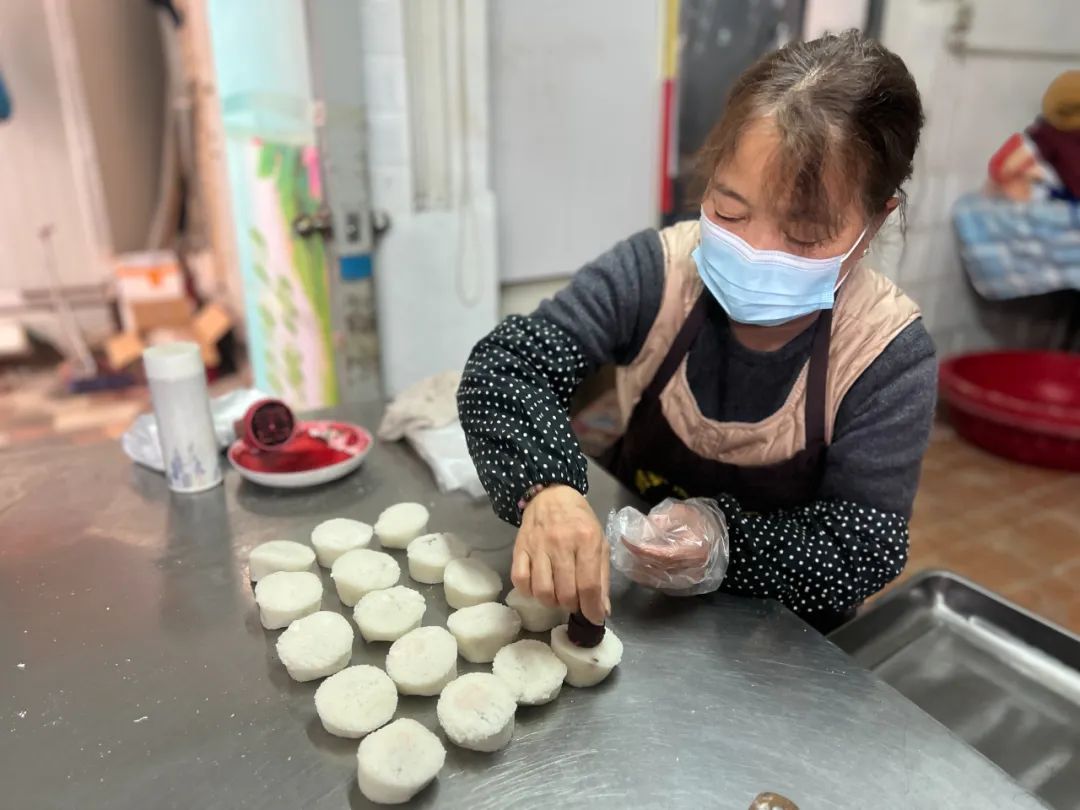 然后,阿姨们把筛好的米粉放在蒸笼里,一层一层地铺好,撒上一些红枣、核桃仁、蓝莓干等食材。盖上笼子蒸了一会儿,房间里弥漫着“幸福蛋糕”的甜味。