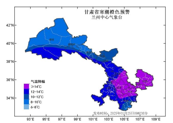 2025年1月25日10时10分,兰州中心气象台将寒流黄色预警升级为寒潮橙色预警:受强冷空气影响,25-27日,我省大部分气温持续下降,陇中、陇东及天水北部气温下降14℃以上,出现超强寒流,最低气温将降至-24。~-16℃,其中平凉、庆阳两市最低气温下降16℃以上,降至-22℃。~-17℃。河西五市、白银、平凉、庆阳三市25日有5-6级西北风,阵风7-8级。注意预防!