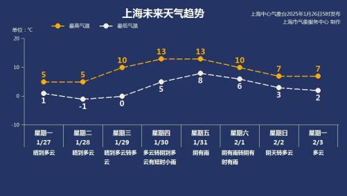 一月三十日(星期四):多云转阴至阴天有短时小雨,5~13℃