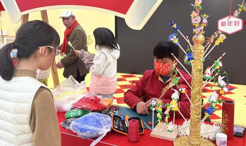 “家门口”的文化盛宴,为即将到来的春节节省了足够的年味。在糖画摊上,手工艺师以糖为“墨”、以石板为“纸”,用木签勾勒出吉祥的传统图案。吹糖师傅从热气腾腾的小锅里拿出透明的糖稀,用手捏、拉、拉,生动的小动物形象跃然掌心。