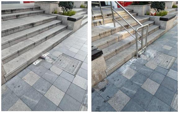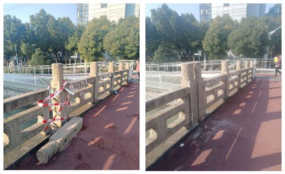 临汾路街道网格检查员在检查过程中发现桥梁栏杆损坏,这是居民进出社区的必经之路。人流量大,桥下河水深,存在安全隐患。检查人员随后通过城市运输平台报告问题,并会同街道守护人员对现场进行安全警示,并通知街道应急维护团队进行维护,确保居民出入安全。