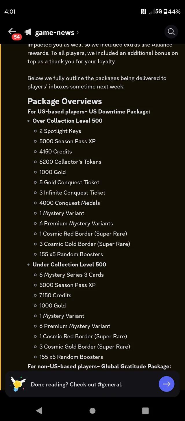 IT 世界注意到,对于受到服务中断影响的玩家进行补偿,《Marvel Snap》Discord 服务人员公布了一系列的补偿计划。 Reddit 上面发布的截图显示,补偿内容包括游戏中的积分、代币和特殊卡组合,适用于在美国创建帐户或在过去 30 天空中有美国活动记录的玩家。非美国玩家还将获得“全球感恩礼包”,其中包含类似但较少的奖励。