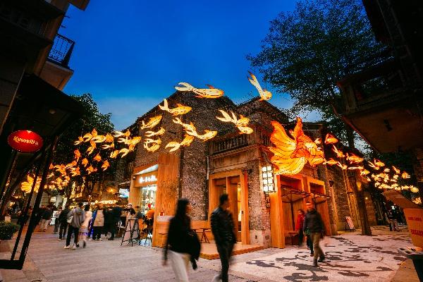 春节期间,佛山岭南天地仍在佛山老街“长生树”规划“鱼庆长生”佛山彩灯挂饰。