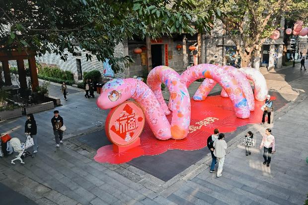 据悉,“灵蛇姿势”粤语谐音为“零舍姿势”,意思是特别有勇气,意思是新的一年运势有所提升,自信、从容、充满活力。青砖建筑之间隐藏着两个灵蛇艺术装置和“新福蛇”春联,传递着满满的祝福和满满的祝福。