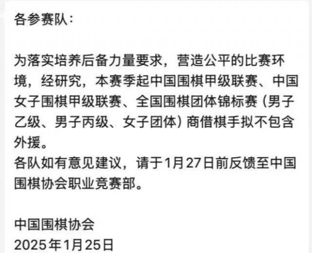 昨天,一张通知截图在网上疯传。截图是中国围棋协会给围棋队发的临时通知。通知中,围棋协会要求围棋、女子围棋、全国团体比赛(男子乙级、男子丙级、女子团体)是否包括外援。