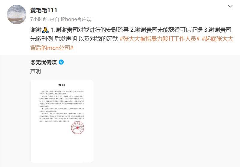 对@黄毛毛1111 被无忧媒体工作人员威胁的问题,该声明只表示“然后继续对其进行安慰和疏导”。